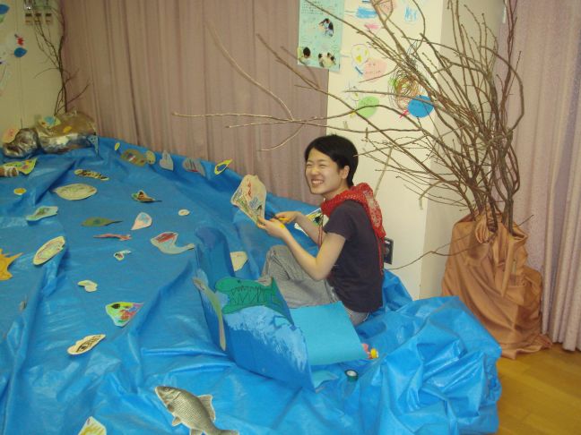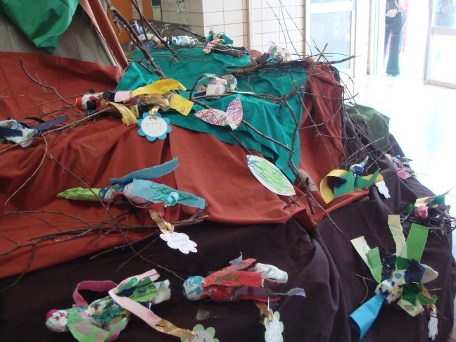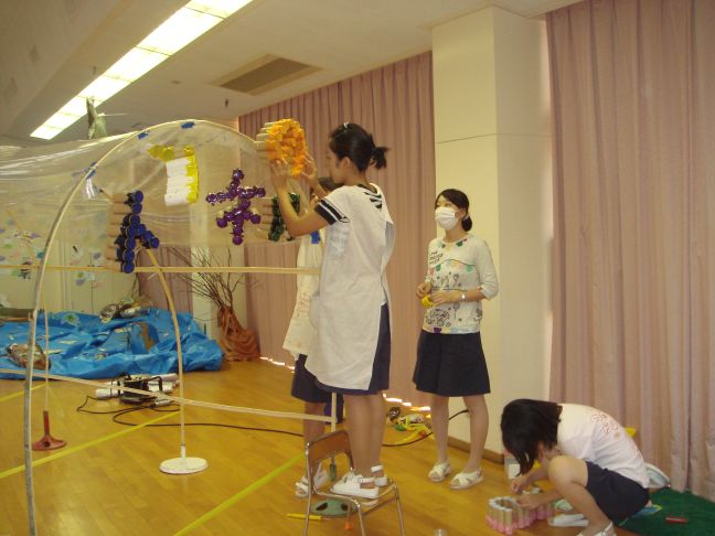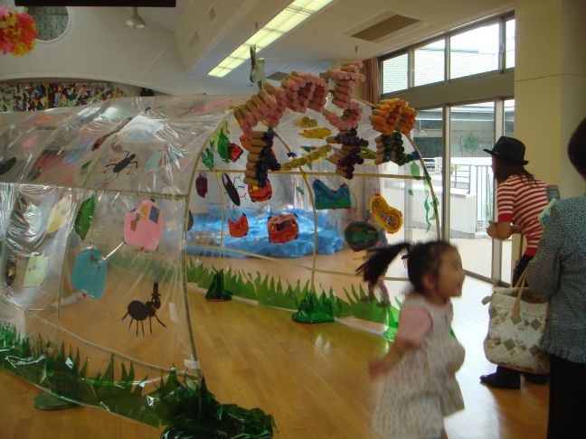 食物連鎖という難しいテーマをトンネルに飾られた作品で表現しました。自然の光がきらきらと差し込んでとってもきれいでした。