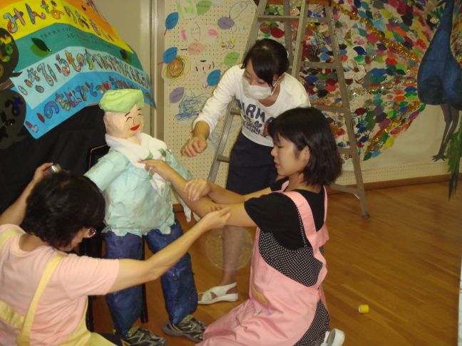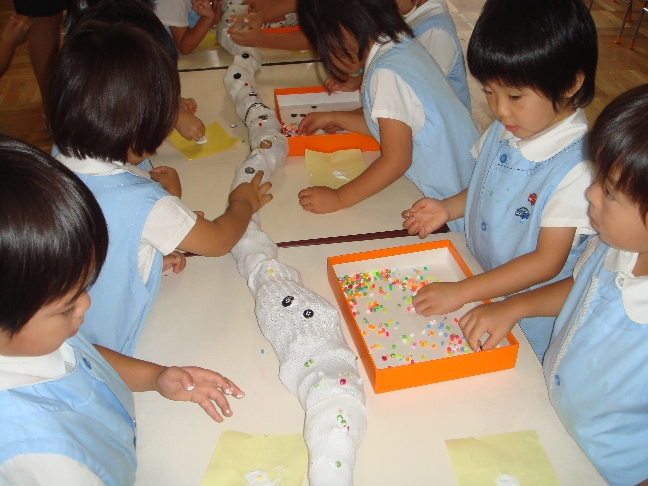なにやらみんな集まって、靴下に廃材をつめこんだ長ーいものに飾り付けをしていました。