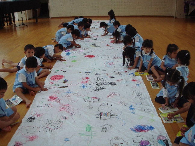 大きな一枚の紙に森の虫たちを描いていました。てんとうむし、かぶとむし、ちょうちょ・・・とかげを描いている子もいましたよ。