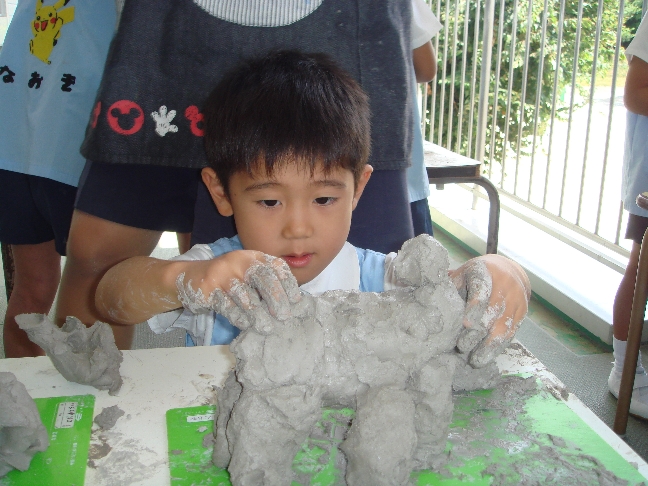 土粘土に挑戦! 思い思いの動物を作っていました。