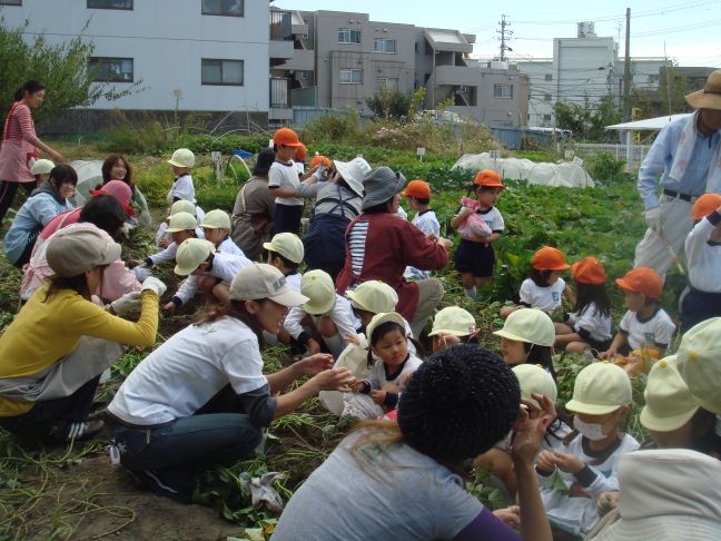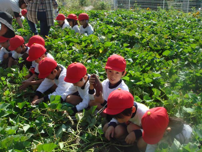 5月の体験デーで植えたさつまいもの苗。すくすく育って、下の地面が見えないくらい大きく成長しました。
