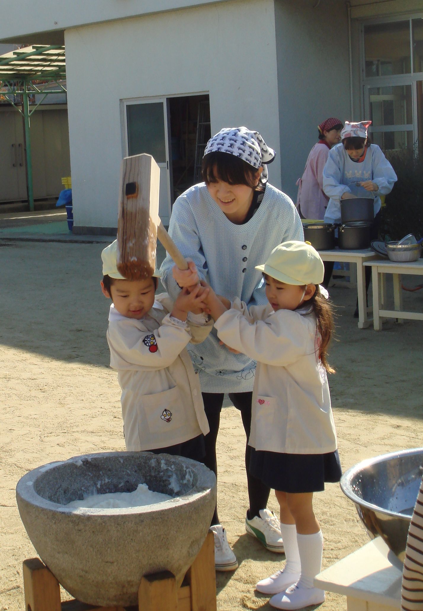 最初に園長先生、タマセイさん、体操の先生、眞野さんが威勢よくおもちをついてくれました。