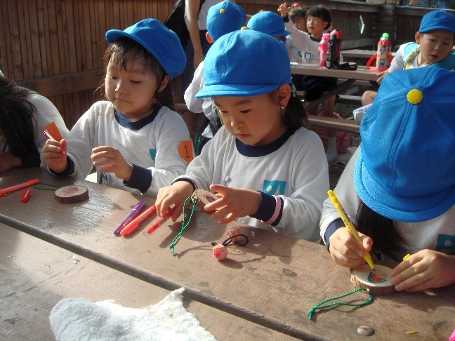 ご飯の後は、木片に絵を描いてキーホルダーを作ったり、大きなボールプールで遊んだり、アスレチックの遊具で遊んだりしました。