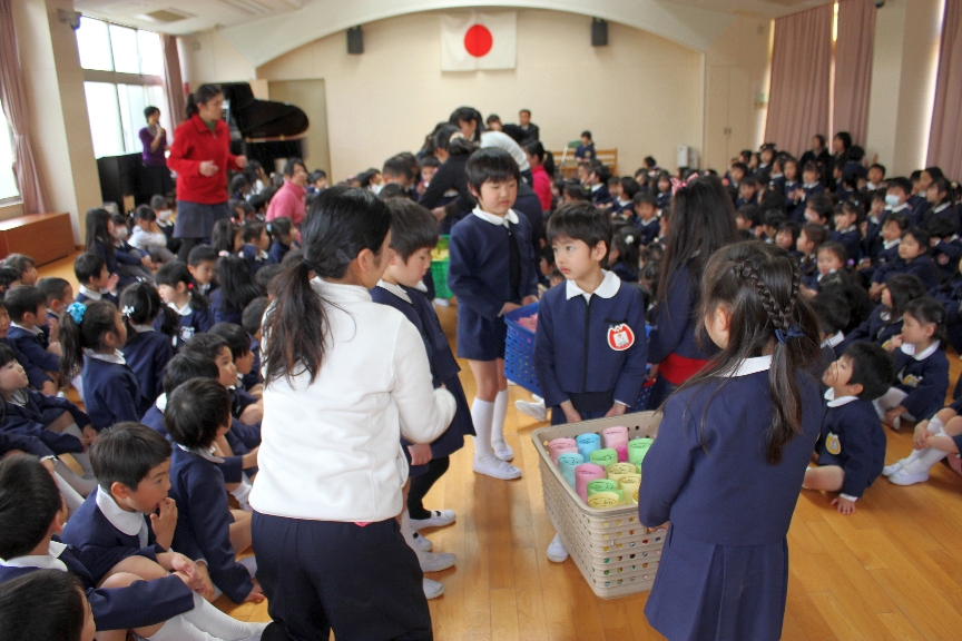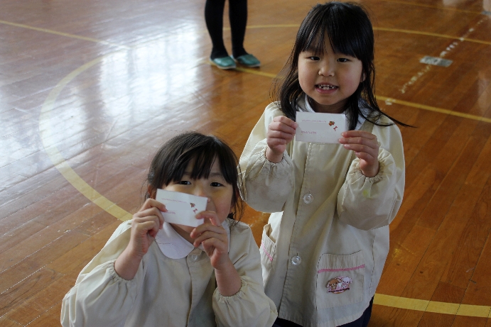 それから、黄組、赤組さんから青組さんへお礼の言葉と手作りのプレゼントをしました。