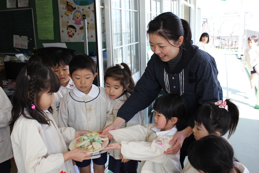 給食室で蒸してもらって、できあがったおこしものは、赤組・青組さんのお兄さんお姉さんにもおすそわけしました。1年間、いろいろやさしくお世話をしてもらったお礼です❤
