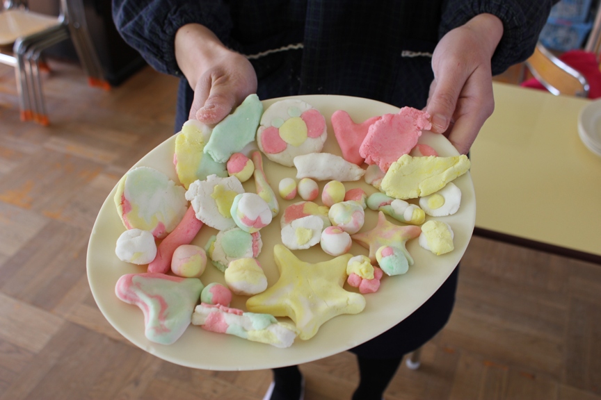 今日は給食室で作ってもらった生地で、思い思いの好きな形のかわいいおこしものを作ります。