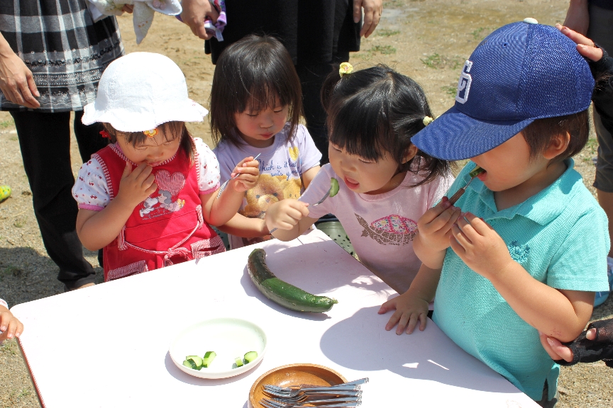 それから、今日は、畑できゅうりが初収穫できました♫ みんなでとれたてのきゅうりをさわってみました。