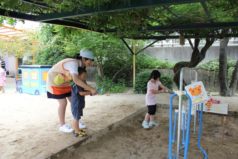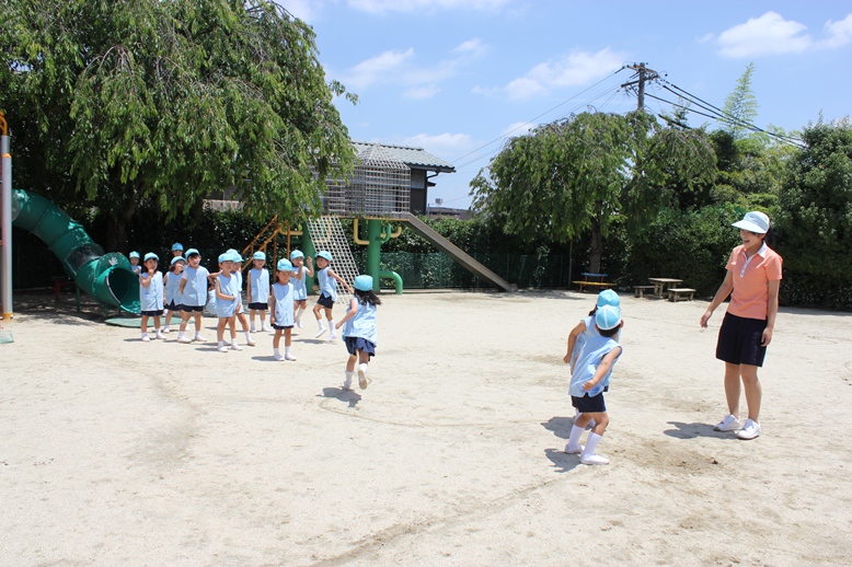 7月24日、昨日に引き続き、今日も縦割り保育で元気いっぱい遊びました。