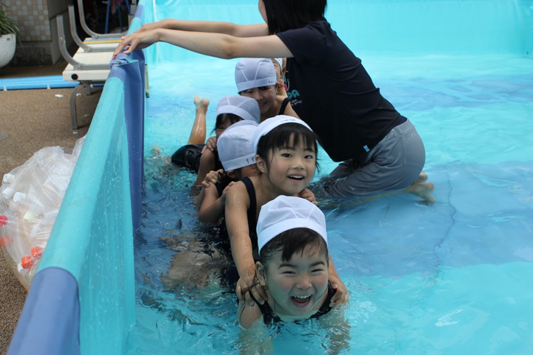 お水の中で動物さんになったり、みんなで電車を作って歩いたり、