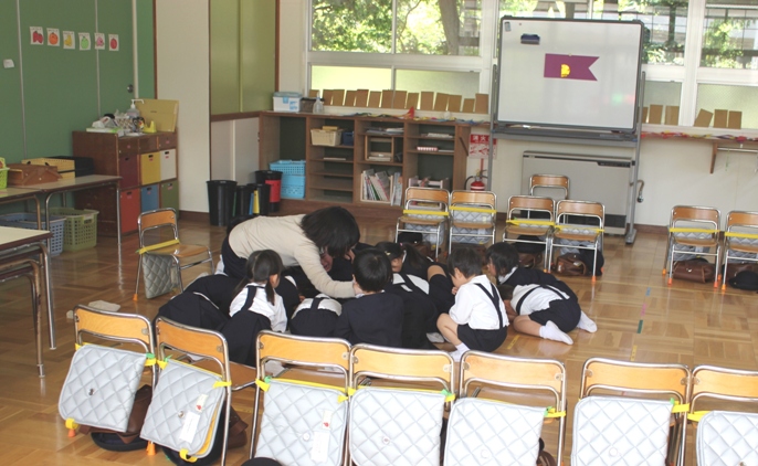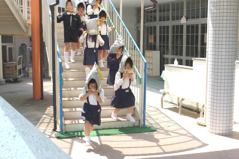 の放送とともに、防災頭巾をかぶり、先生について運動場へ避難を開始します。
