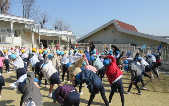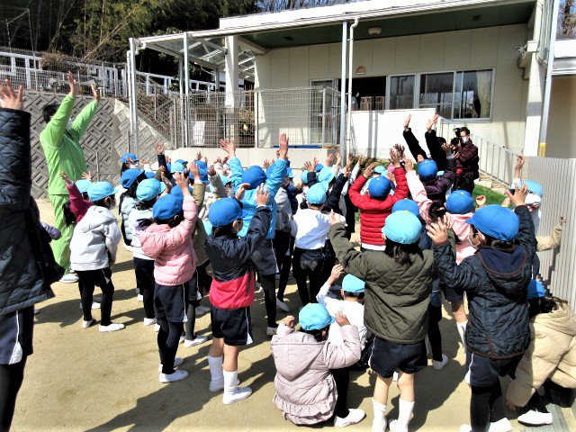 最初に全園児で、外朝礼です。ラジオ体操をして、しっかり体をほぐしますよ!!
