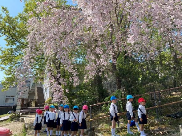 さあ、お外あそびに行きましょう! 森の運動場では、しだれ桜がまだ、満開!!