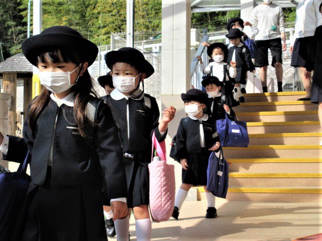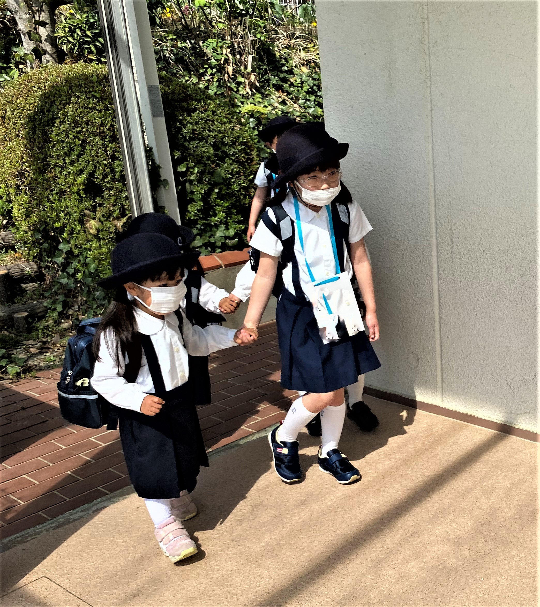年少さんも年長さんに手をひいてもらって、安心して登園!!