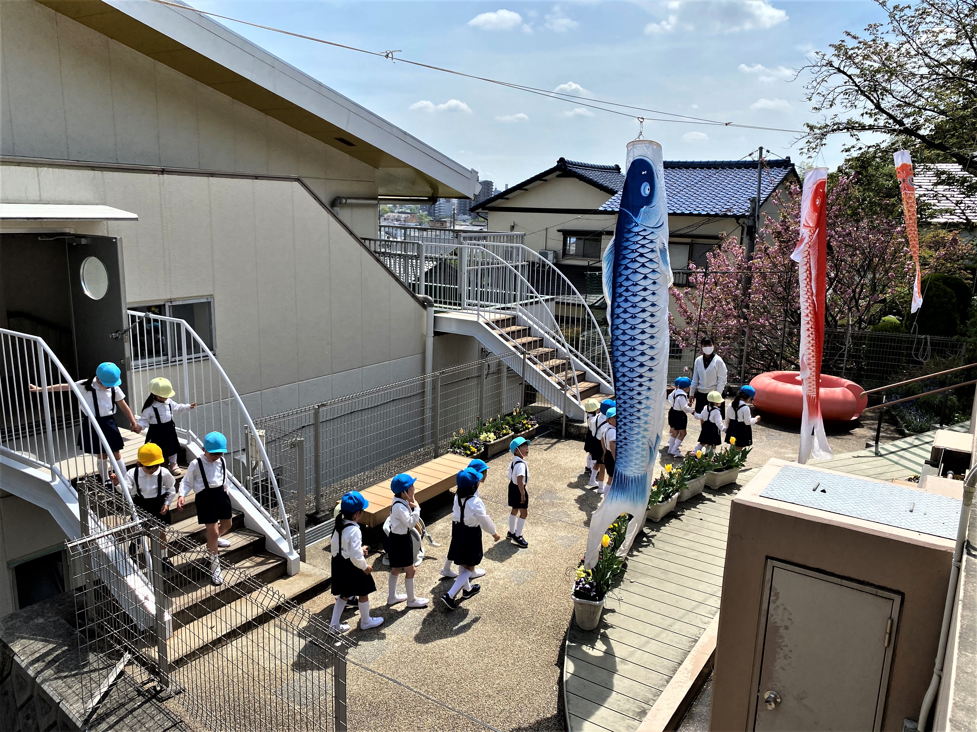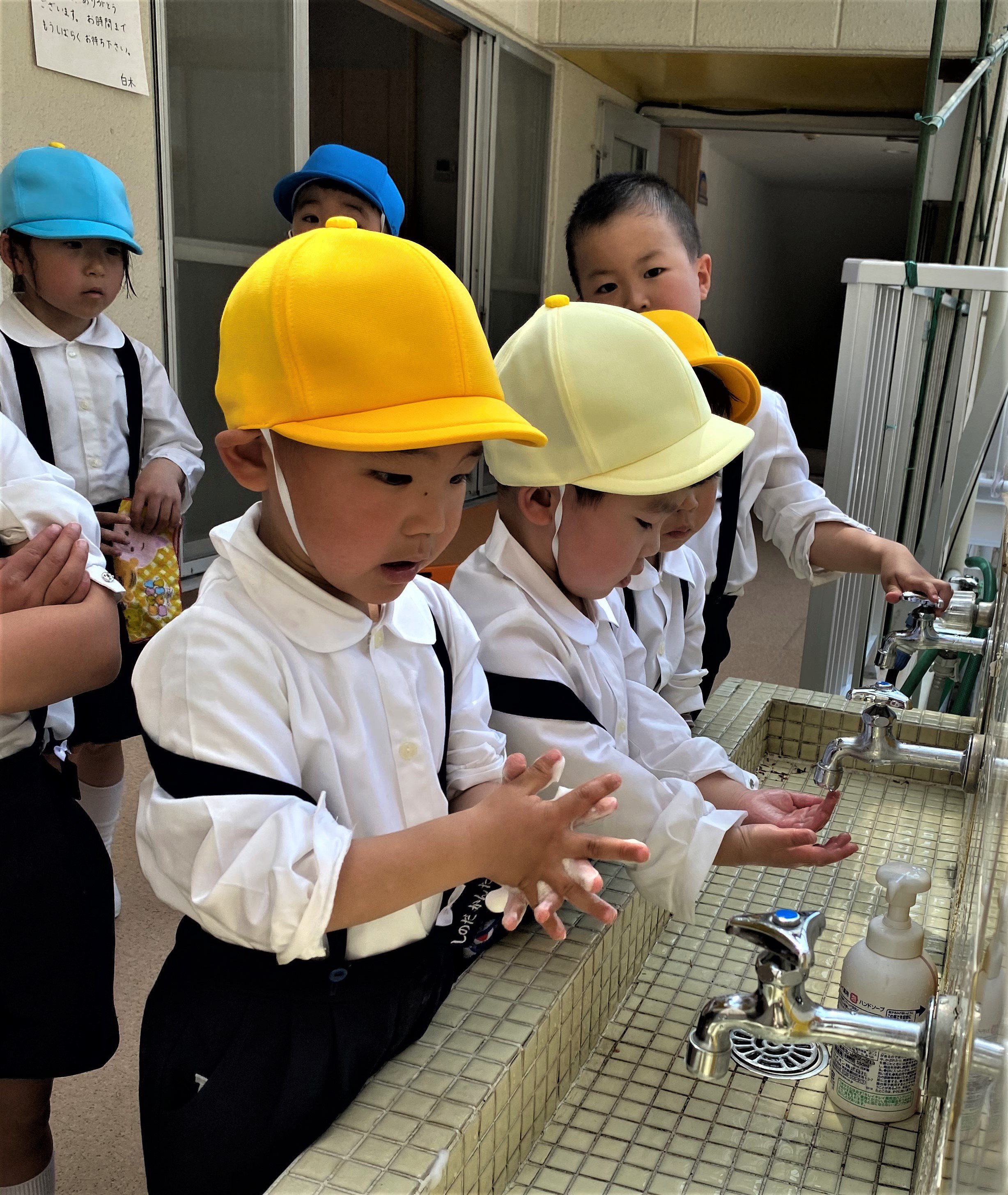 12日は、年長・青組と年中・赤組、13日は年長・青組と年少・黄組の初登園でした。