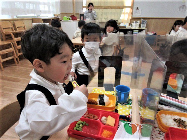 年少・黄組は、交流昼食会で、年中・年長さんと一緒にお給食をいただきました。![]()