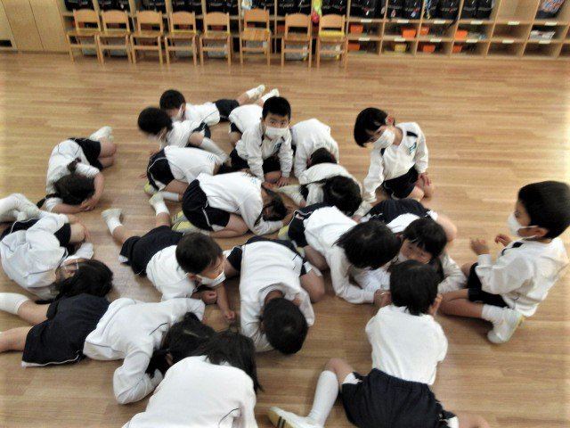 安全が確認されるまで静かに待機します。犯人にみつかってしまわないようにひっそり静かに身を小さくしていた子ども達。