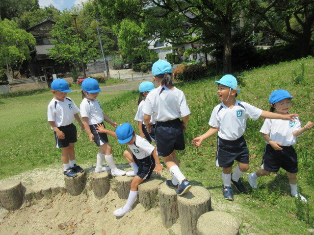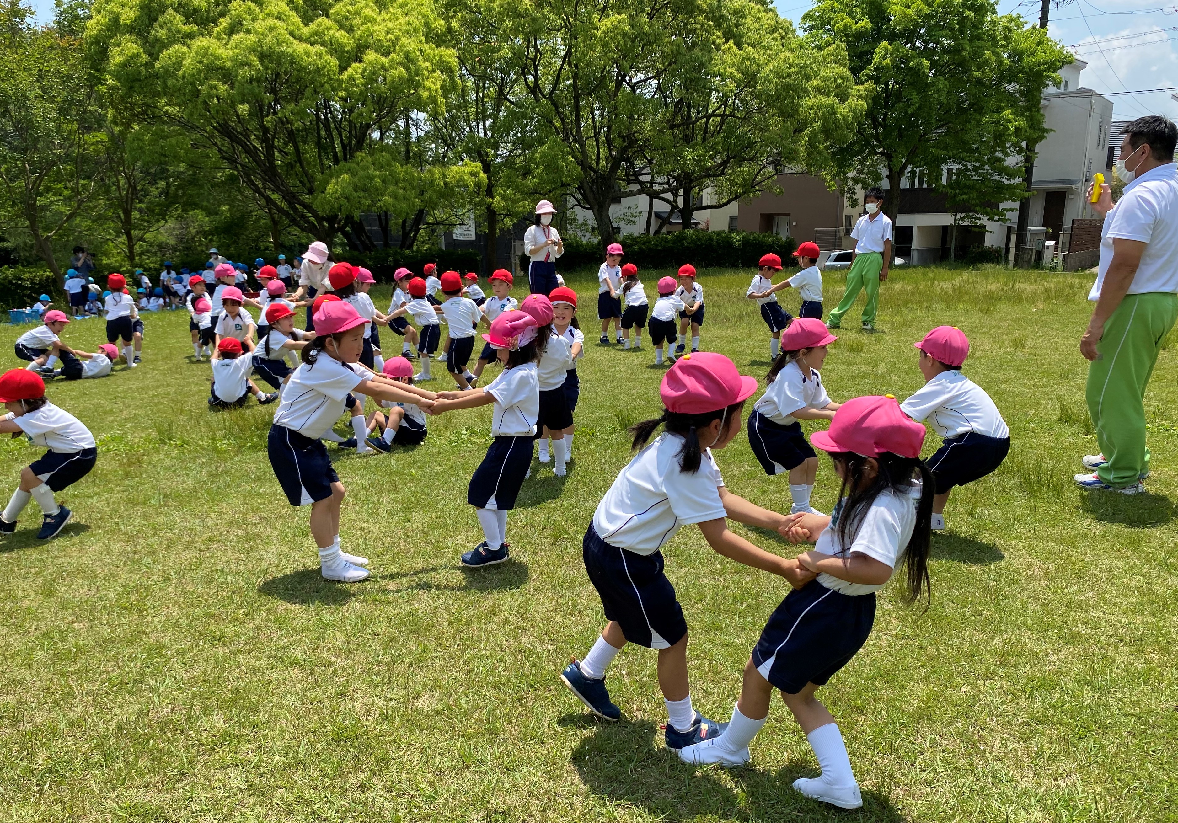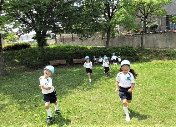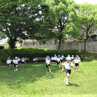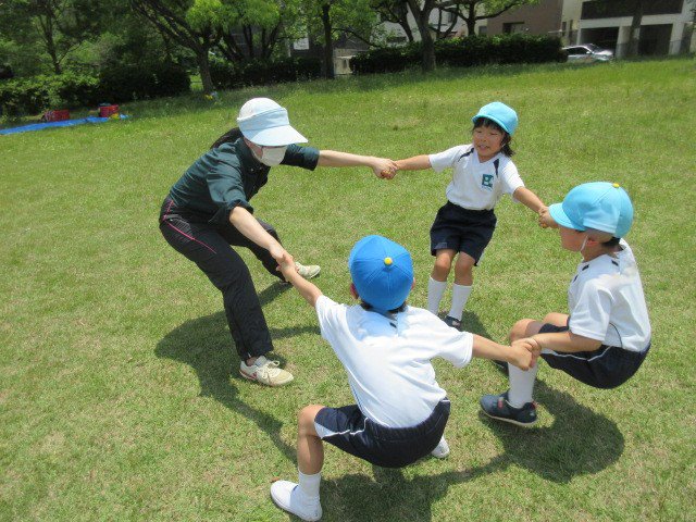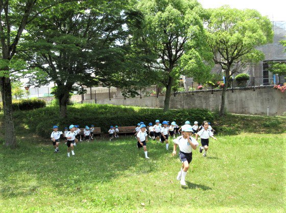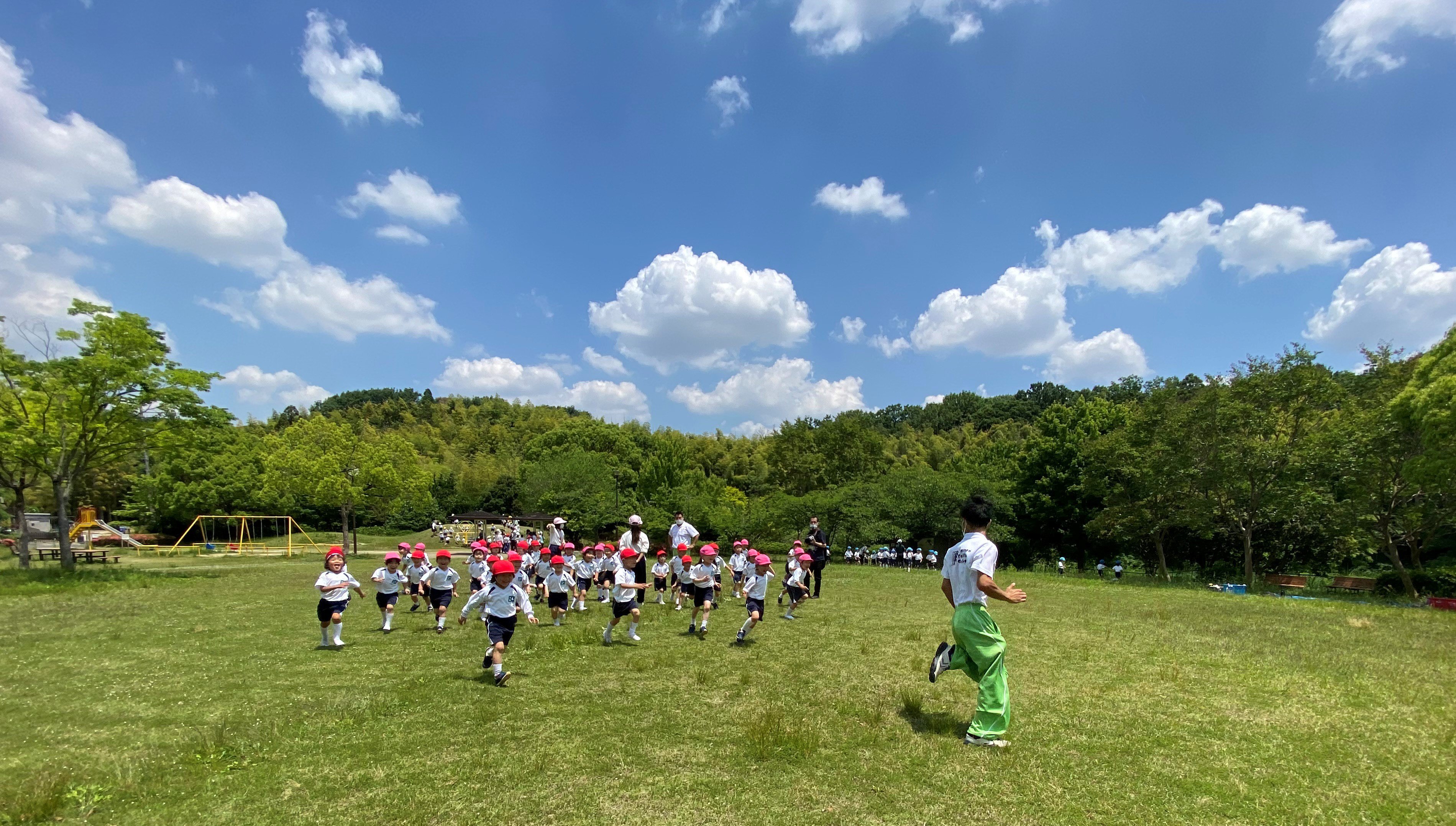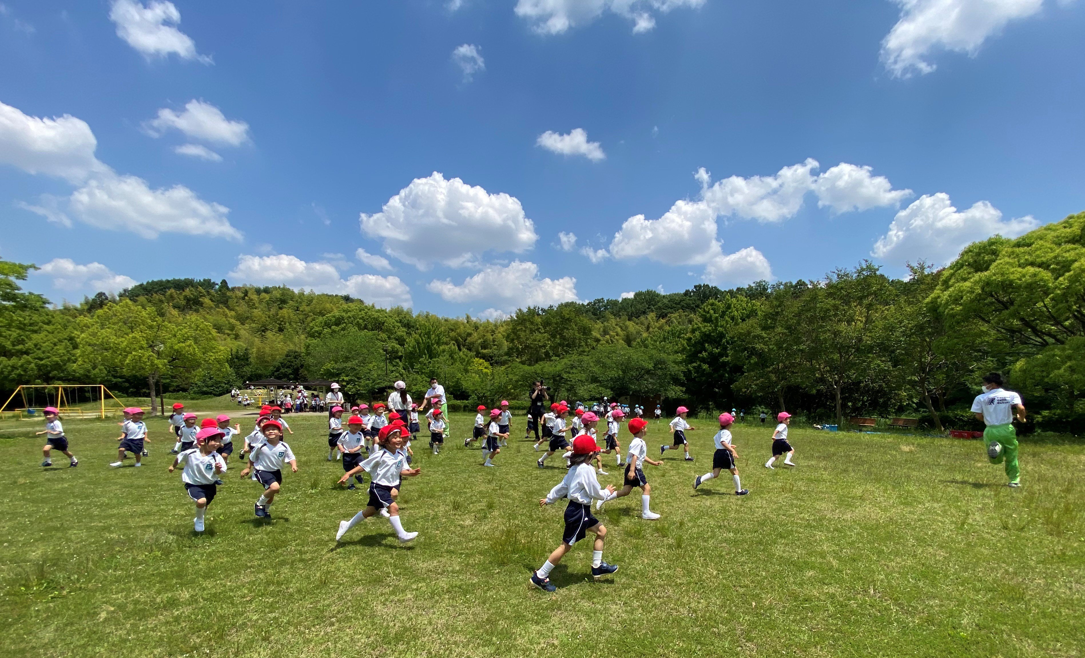 「よーい ドン!」木にタッチ! 先生にタッチ! お花にタッチ!