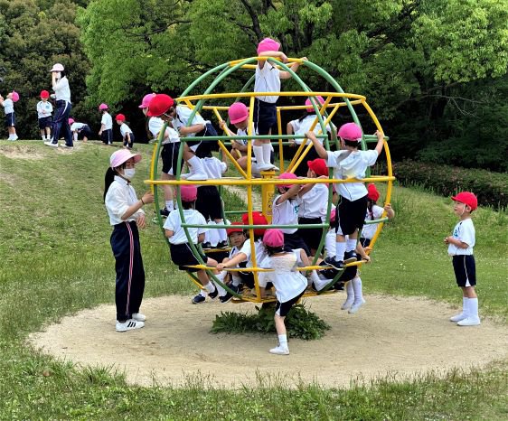 今日は、園外保育で荒池ひろばに来ました。体操の先生と体を動かしたり、遊具、草花あそびを楽しみましたよ。