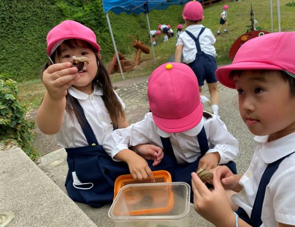 森や園庭の畑探検隊に出発! 手すりにカタツムリ発見!「わあー!小さい!」