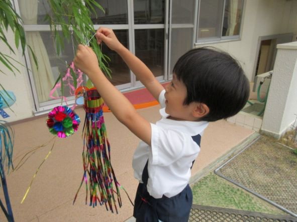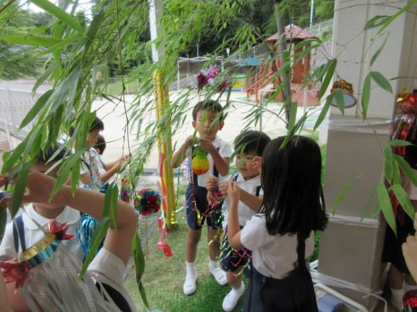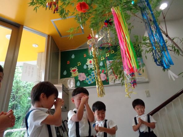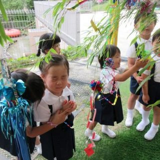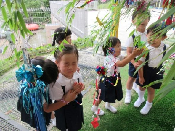 ☆☆☆もうすぐ 七夕☆☆☆ 令和4年7月 7月の始めに、大きな竹が園内2か所に飾られました。 7月7日 七夕に向けて、飾り付けです! キラキラする風鈴や、でんぐり等・・・ みんな一生懸命飾り付け! 吹き流しもキレイですね~~ 飾り付けが終わると・・・、お願いごとをする子供たち・・・。 「なわとびが、たくさん跳べますように!」「給食を残さず食べれますように!」 「お友だちといっぱい遊べますように!」「プールにたくさん入れますように!」 先生たちのお願い事は・・・ みんなのお願い事が叶い、幼稚園のお友だちみんながhappyになれますように・・・。 前の記事 次の記事