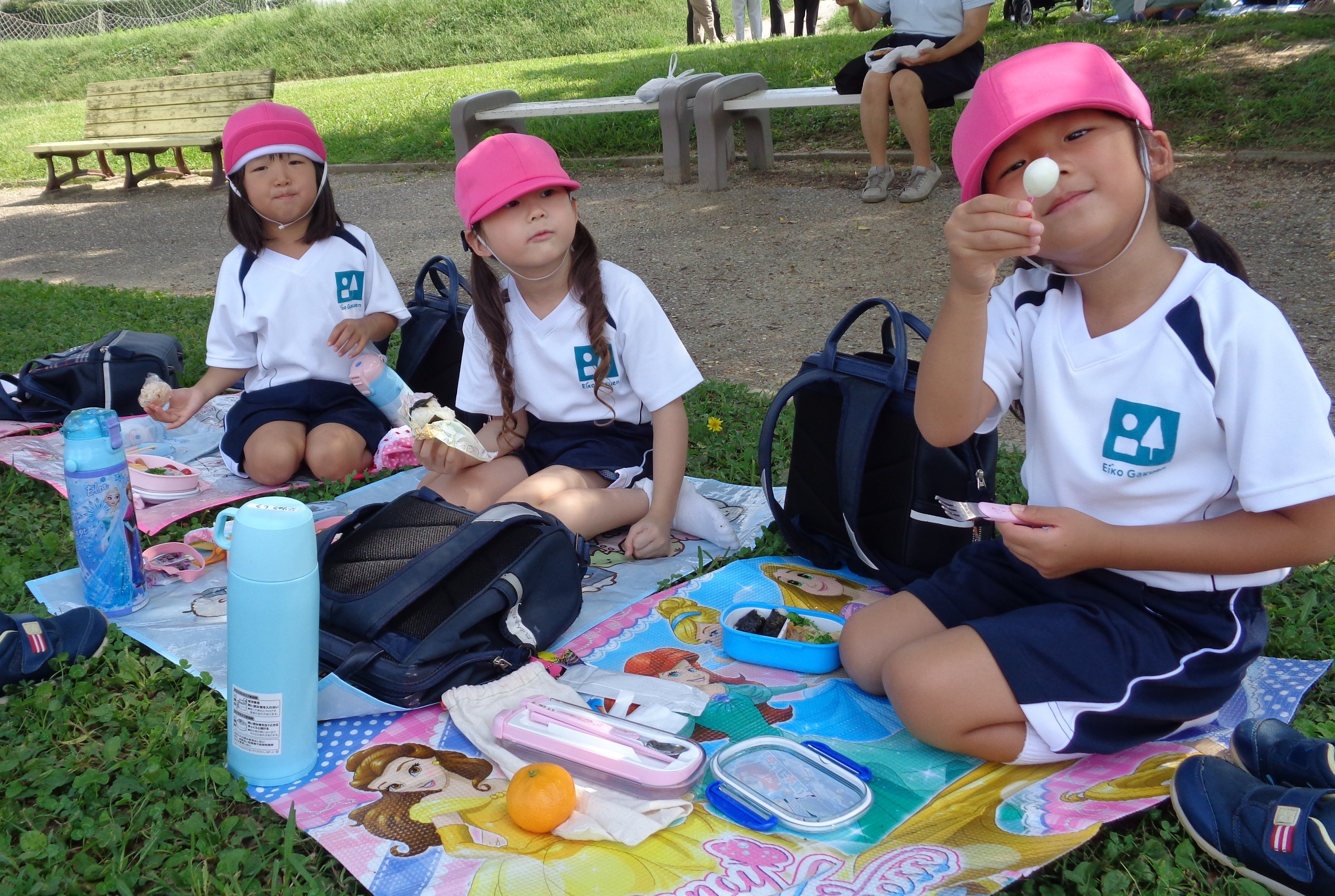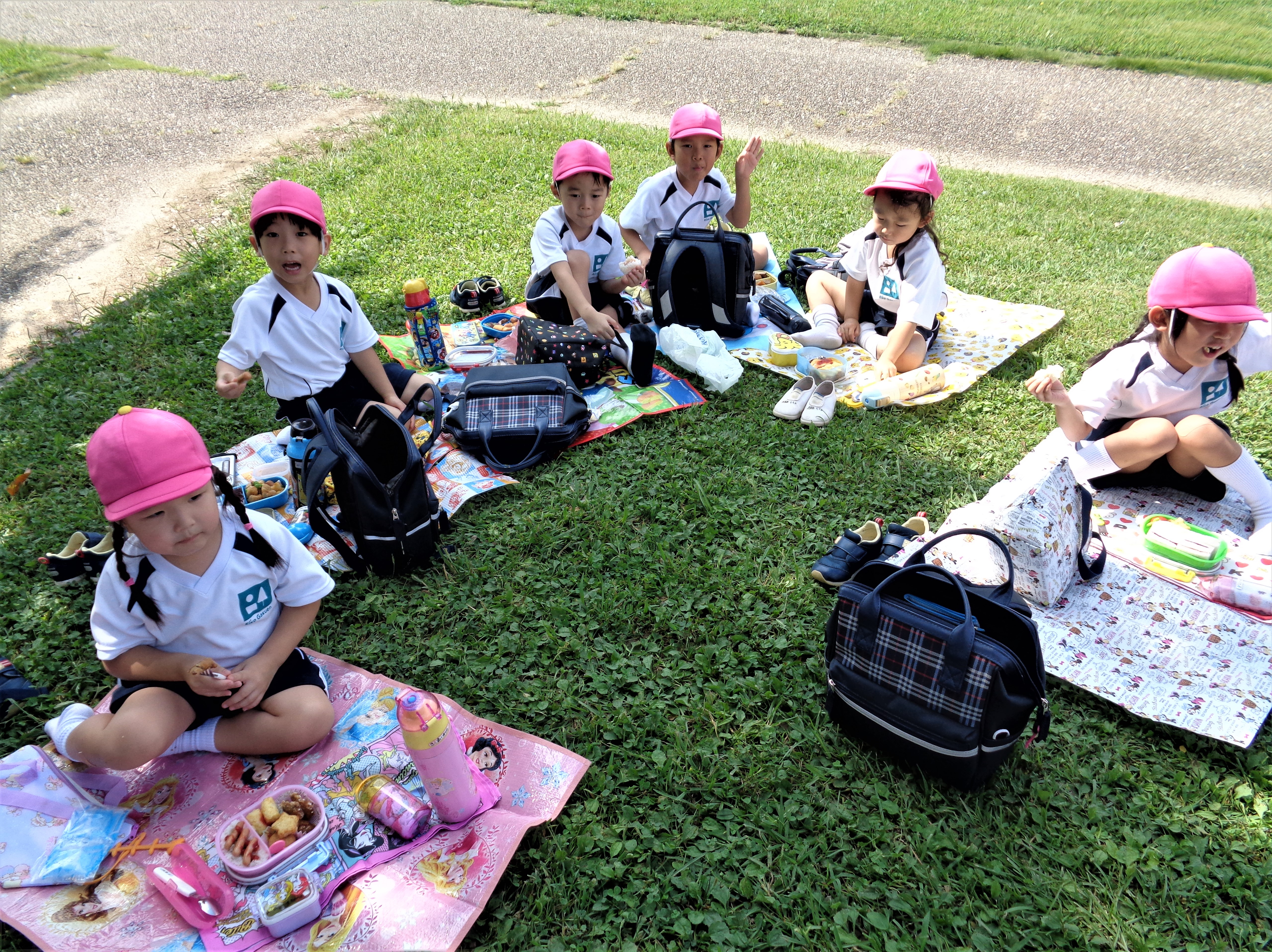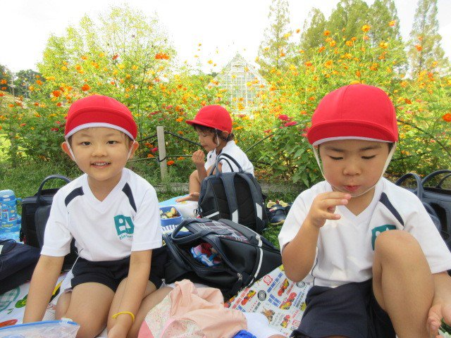 たくさん歩いておなかがペコペコな子どもたち。芝生の上でお母さんの手作りお弁当を「いただきまーす!」気持ちの良い青空の下で美味しくいただきました!