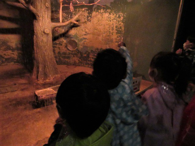 暗い中で、動物を見つけるのは一苦労ですが、「ツチブタが端っこで寝てる!」「コウモリ、上にぶら下がってるよ!」と発見する子どもたち。