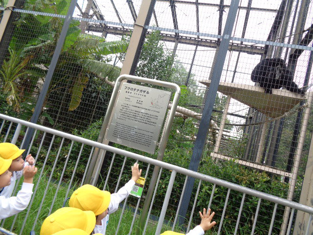 歩いているとフクロテナガサルのケイジの鳴き声が・・・。「わぁ!びっくりした!」「ケイジだ!」と声の大きさに驚きながらもじっと見ていました。