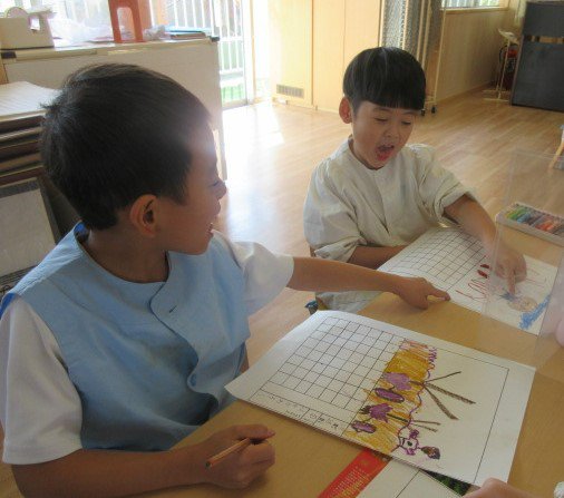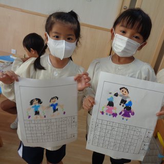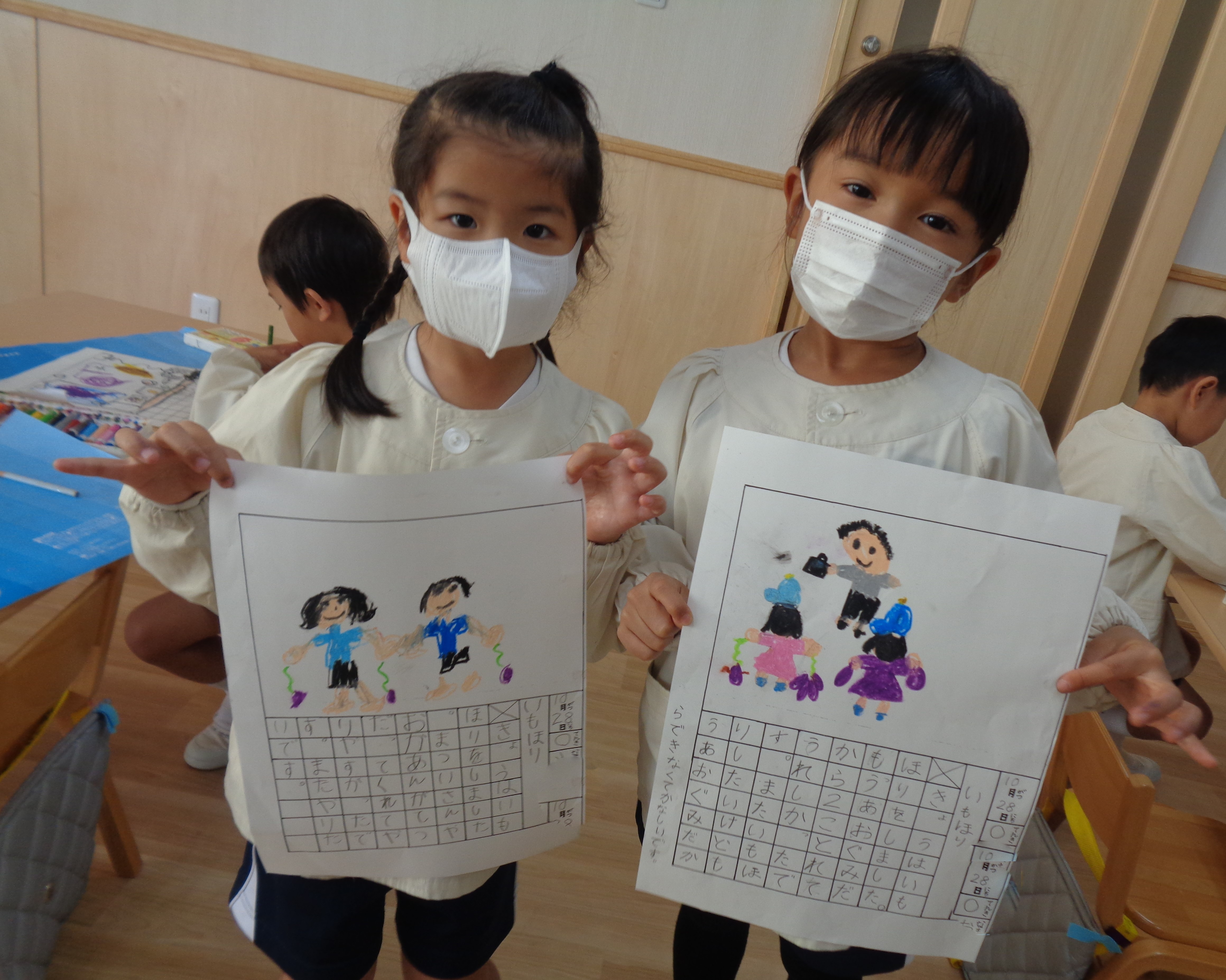 大きなお芋がたくさん掘れた青組さん!芋掘りの絵日記を書きました。両手にたくさんお芋を持っていますね!