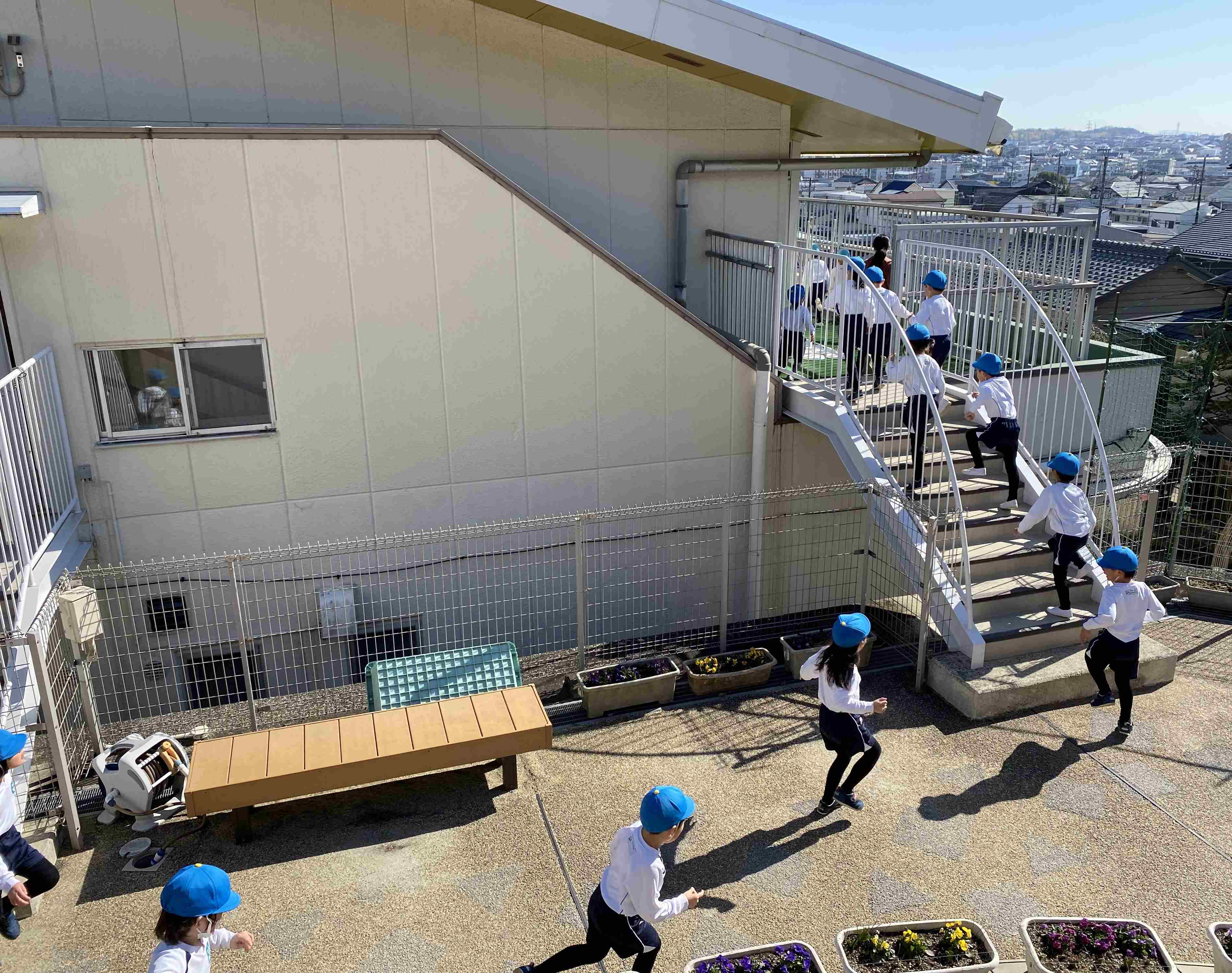 幼稚園のテラスや屋上、そして森の階段を駆け上ったり・・・。