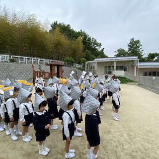 クラスごとに避難して整列。園長先生のお話しを聞きましょう。