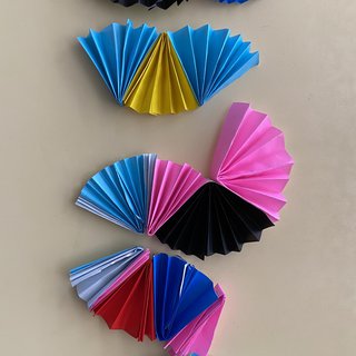 たてわり保育(異年齢保育)の時間に、幼稚園の笹に飾る飾りをそれぞれのコースで作りました。