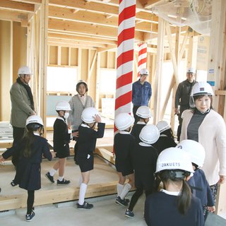 3月上旬に上棟式も終わり、大黒柱が建てられ、屋根もつきました。今週、卒園する年長・青組は、完成をみることができませんので、今日は、見学会を開催。