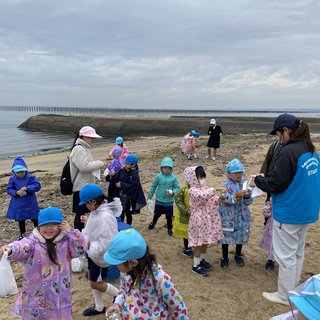 当日は、雨が降りそうでしたので、レインコートを着て海の漂着物探しをスタートしました。