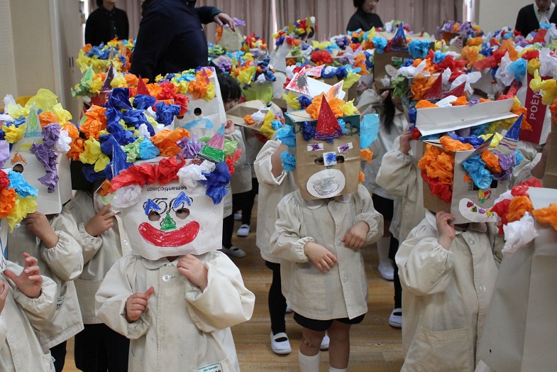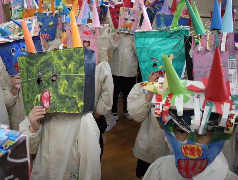 自分で作った鬼のお面を被って豆をぶつけてもらいます。