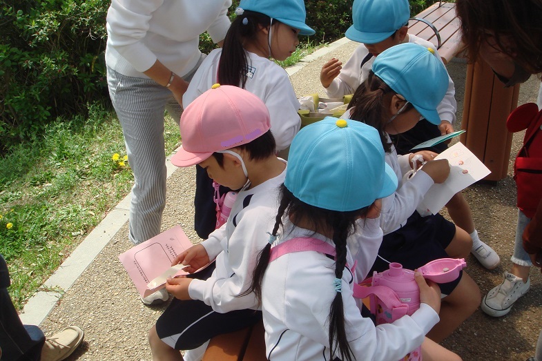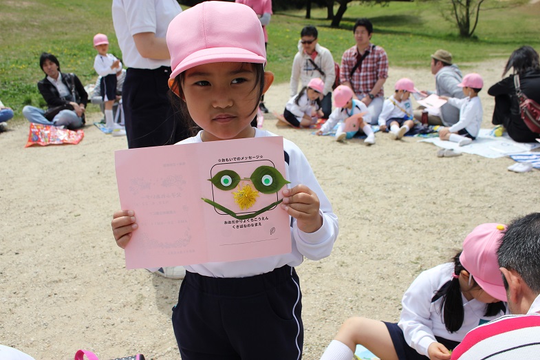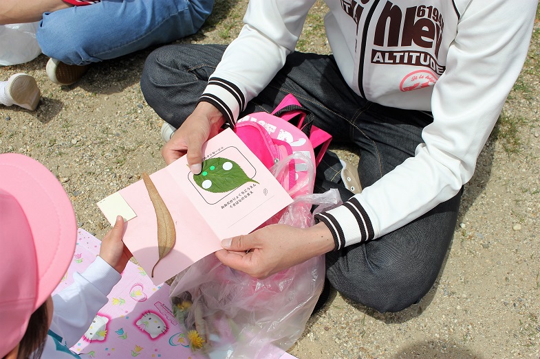 クラスごとに輪になり、カードに葉っぱやお花を貼って