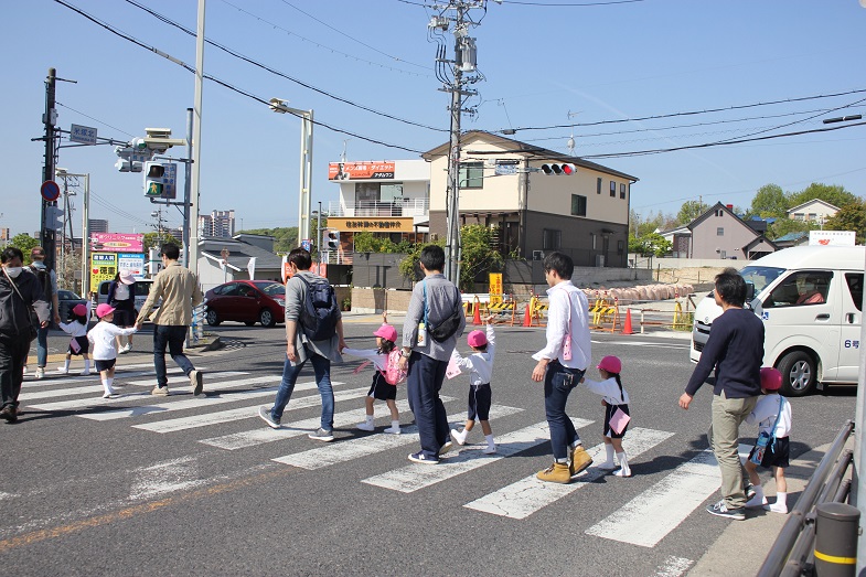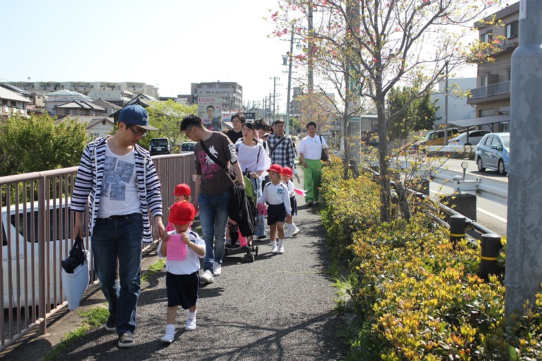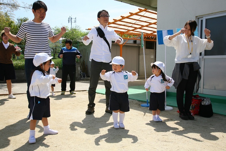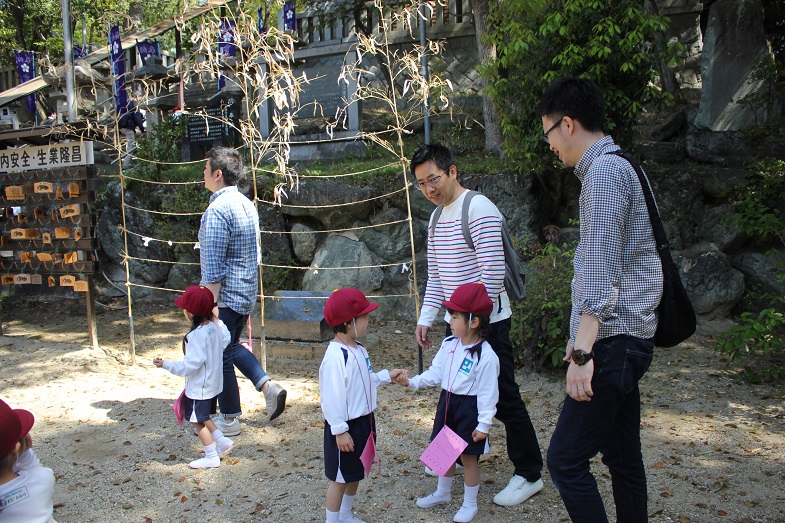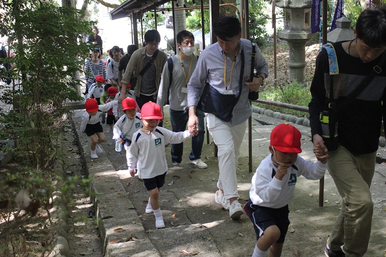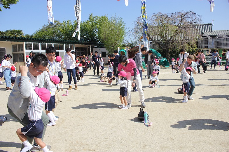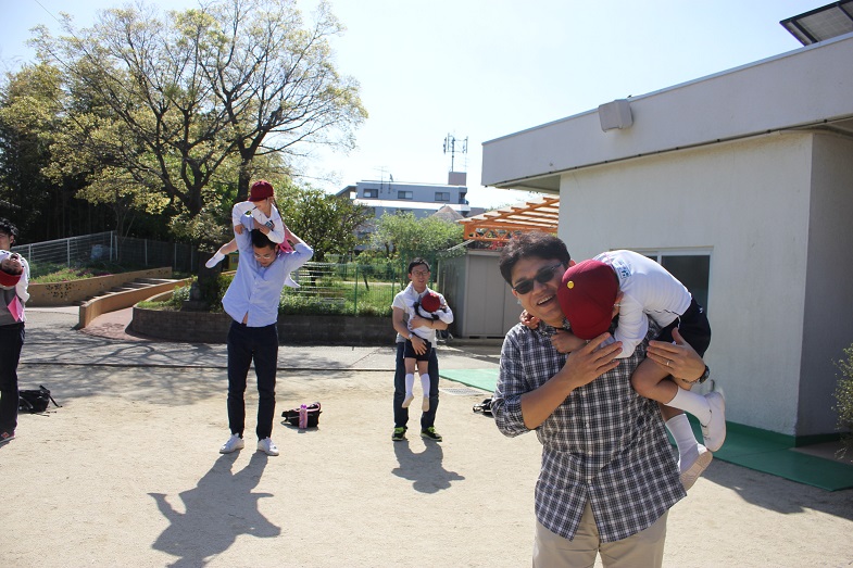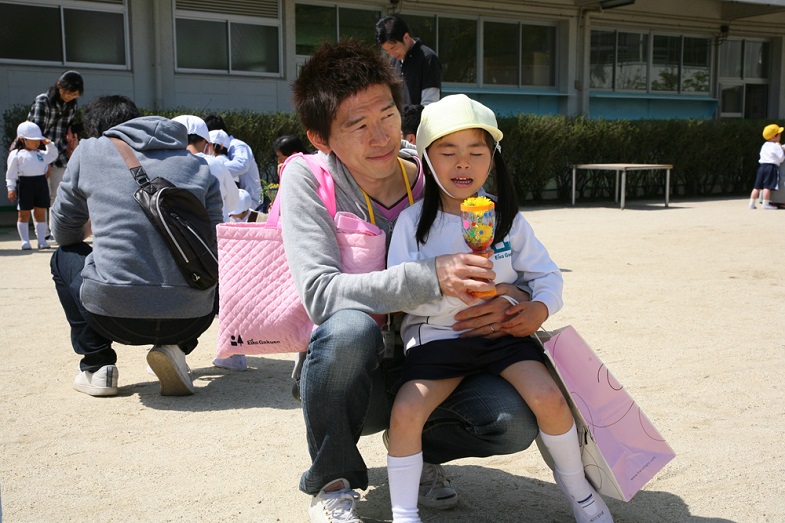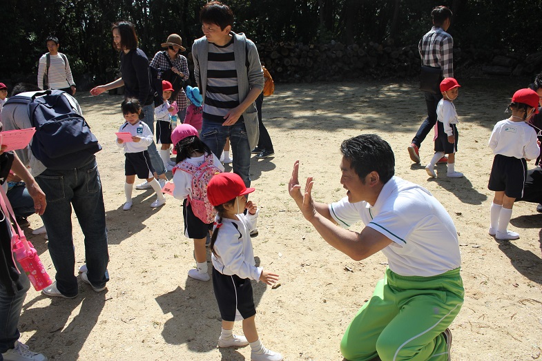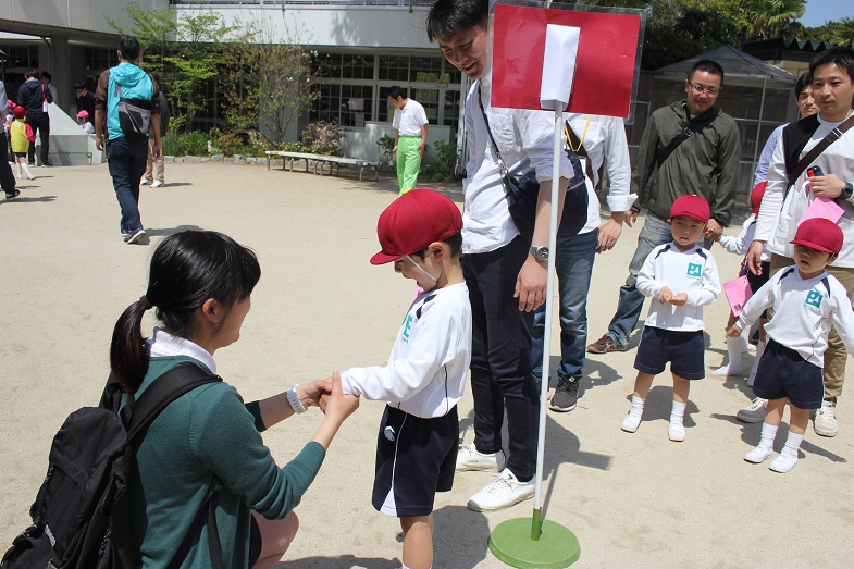 いっぱい遊んだ後は、お父さんと手を繋いで幼稚園へ戻ります。
