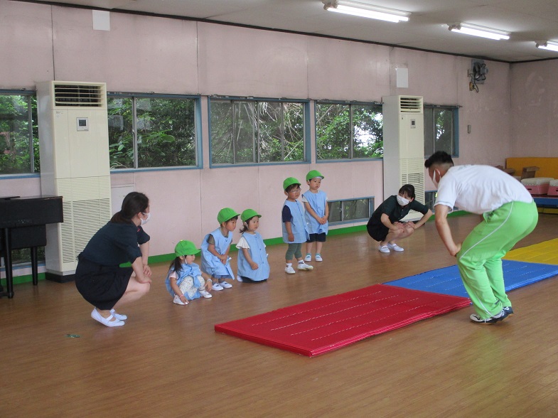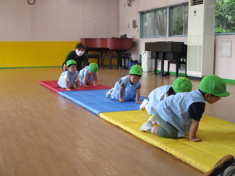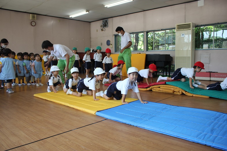 体操の先生と一緒にマットやボールを使って遊びました。