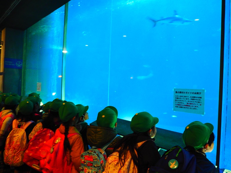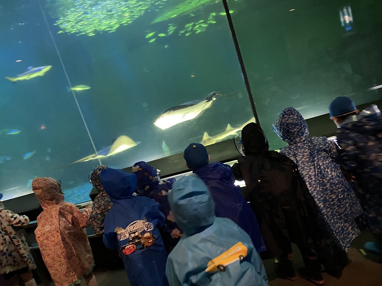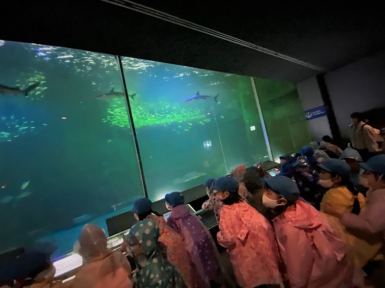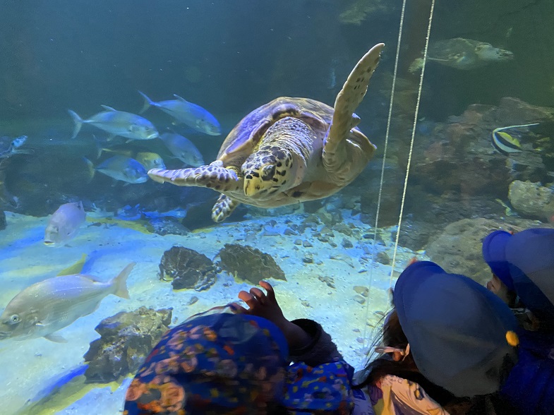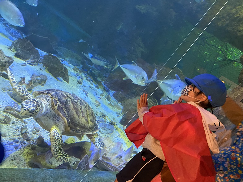 大きな水槽で泳ぐウミガメやエイ、イルカやサメなどは、