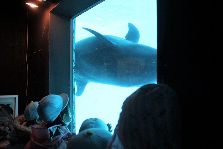 イルカたちが泳ぐ大きな水槽を上から見たり、
