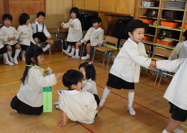 はじめに、『もえるゴミ』『もえないゴミ』『プラスチック製の生まれかわる(資源)ごみ』『紙製の生まれかわる(資源)ごみ』の4つのゴミを持っていくお家を床に設定し、様々なゴミのカードを首からかけた迷い子の子どもたちを、青い帽子をかぶったおまわりさんが連れて行ってあげます。