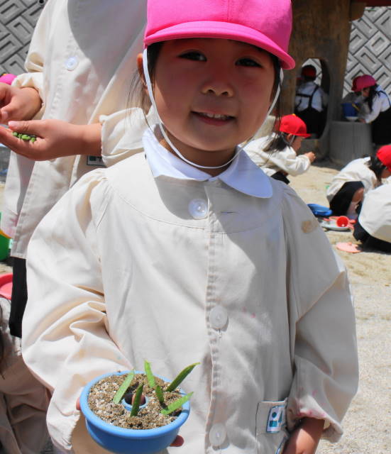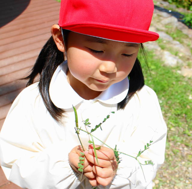 見つけたらエンドウマメを取って、園庭の砂場でままごと遊びをしました。