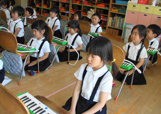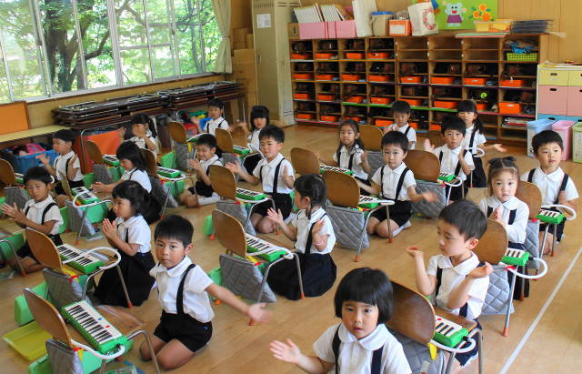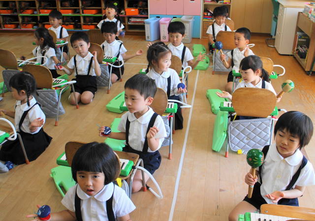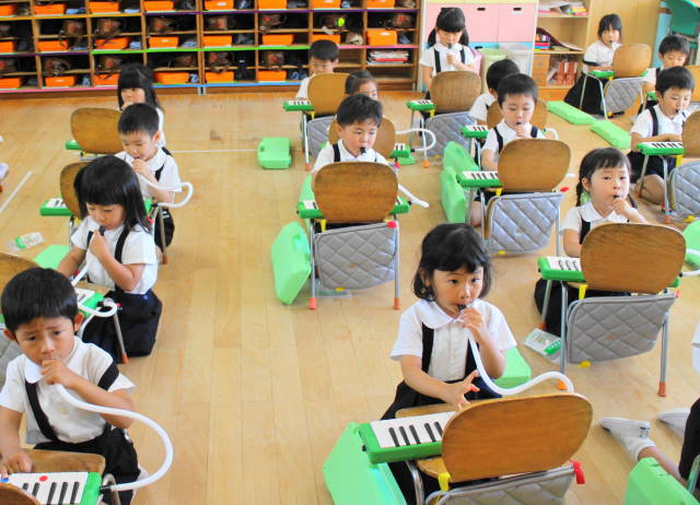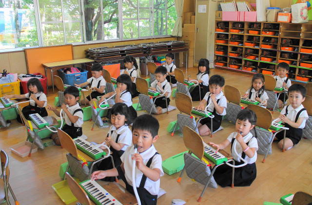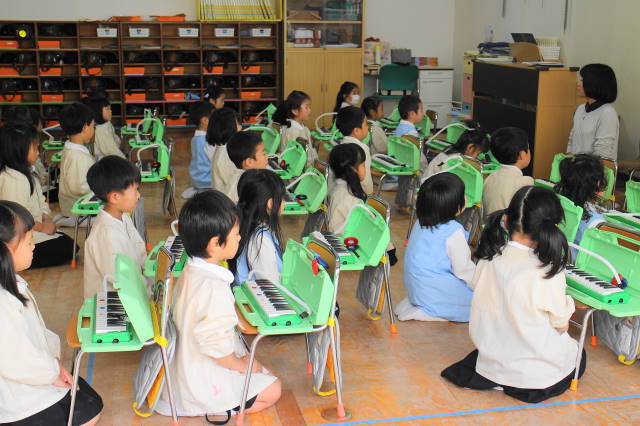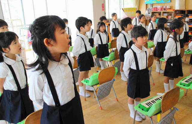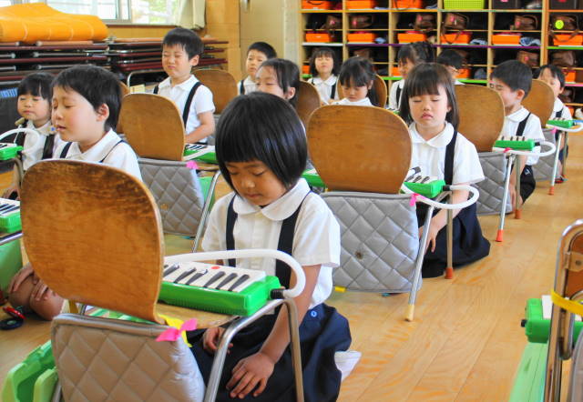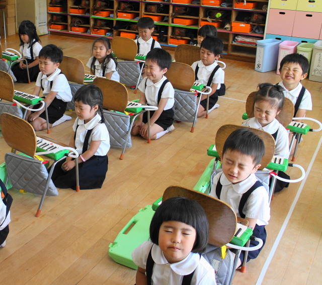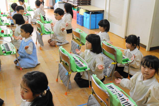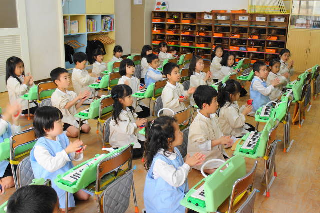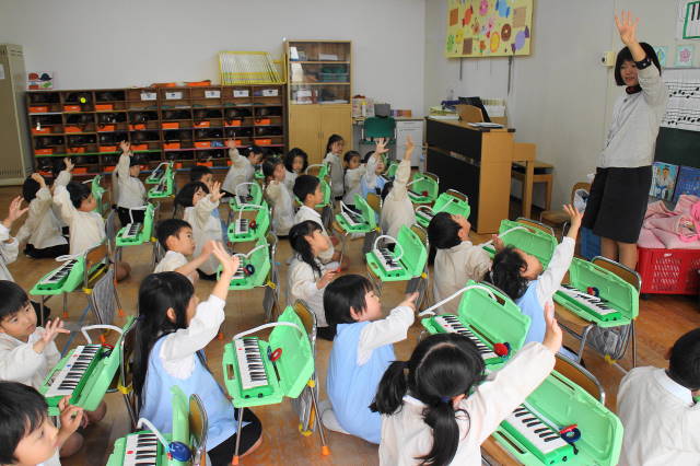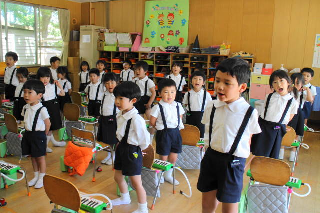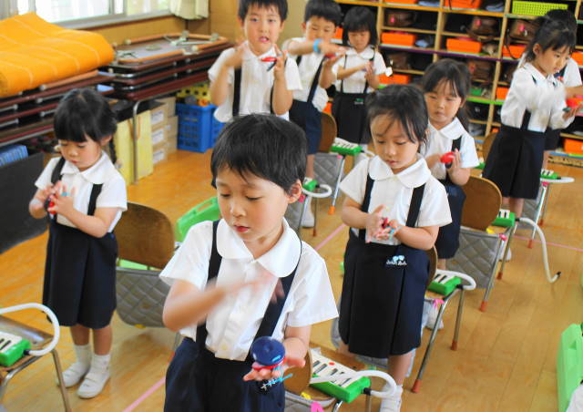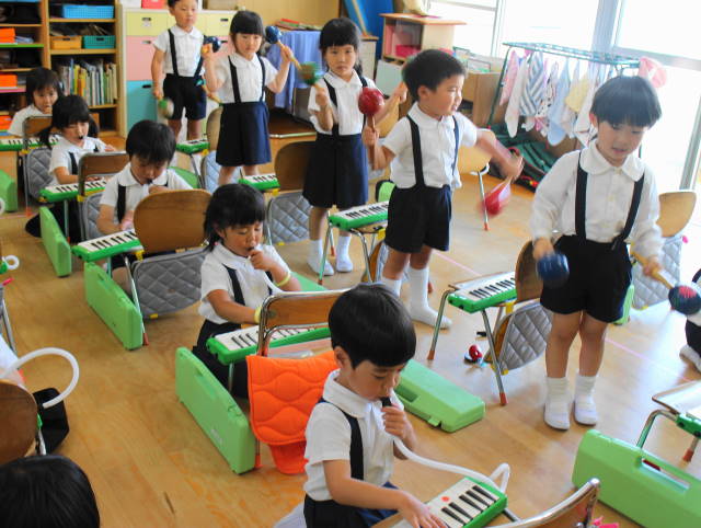 6月には新しい曲『ほたるこい』を行ないます。これからも、聴いたり、たたいたり、演奏したり、合奏したり、いろいろな遊びを通して、音感を養い、集中力を高めていきます。また、みんなで楽しんでいきましょうね!