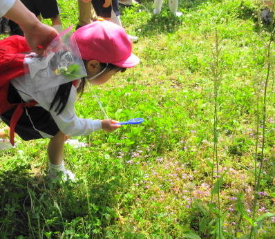 紫色のきれいなお花も見つけました。「虫めがねで見てみよう・・・。」