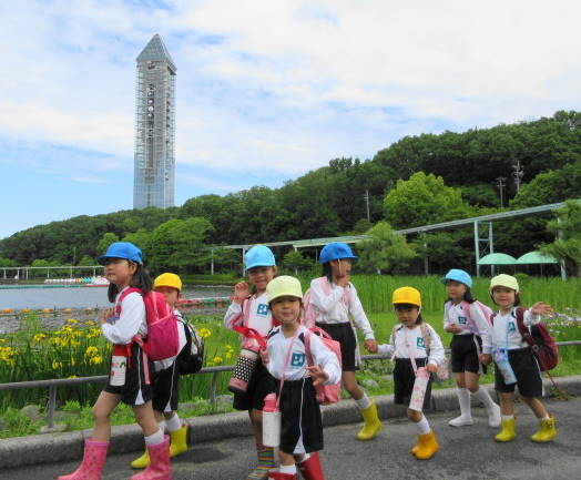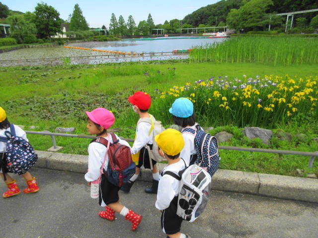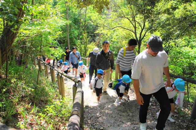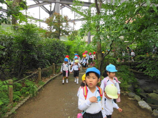 東山の駐車場から上池門まで、年長・青組さんは年少・黄組さんと手をつなぎ、年中・赤組さんは、赤組さん同士で手をつないで、頑張って歩きました。