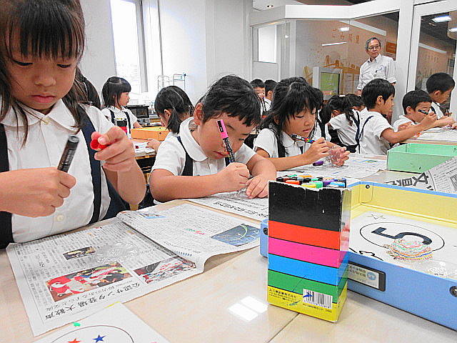 さっそく、いろいろな色で絵を描き、自分なりの作品作りに夢中!