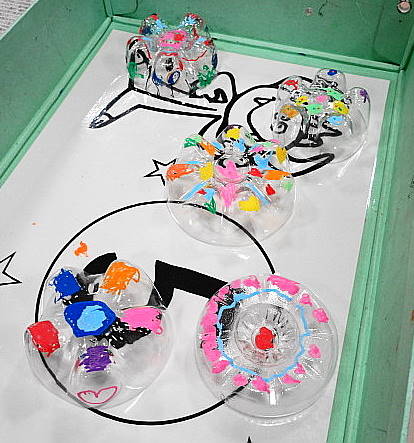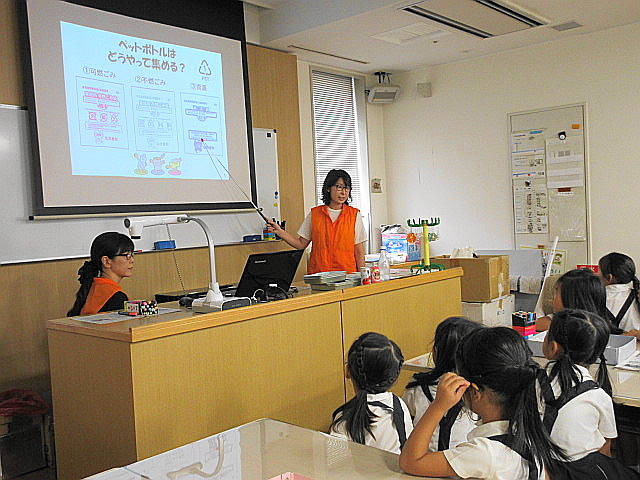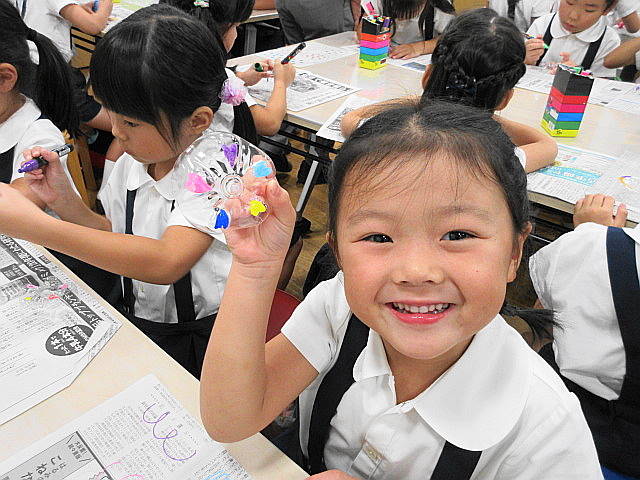 ペットボトルが色々なものに生まれ変われることを教えていただき、「へぇ、〇〇に生まれ変わるんだー」と感心しきり。