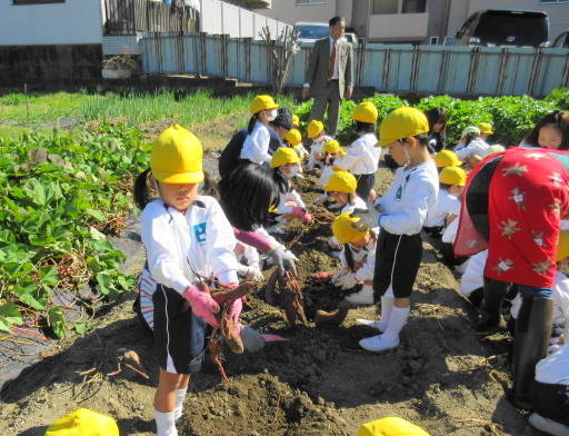 さて、いよいよ芋掘り開始!「土が硬いよー。」「お芋出てこないよー。」