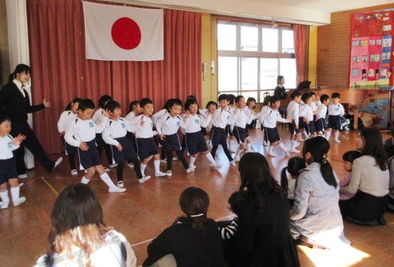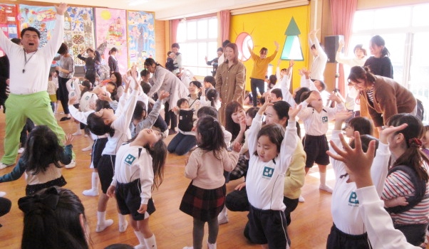 幼稚園の年中・赤組のお友達と体操の先生も一緒に、幼稚園のホールで、『運動あそび』を楽しみましょう!
