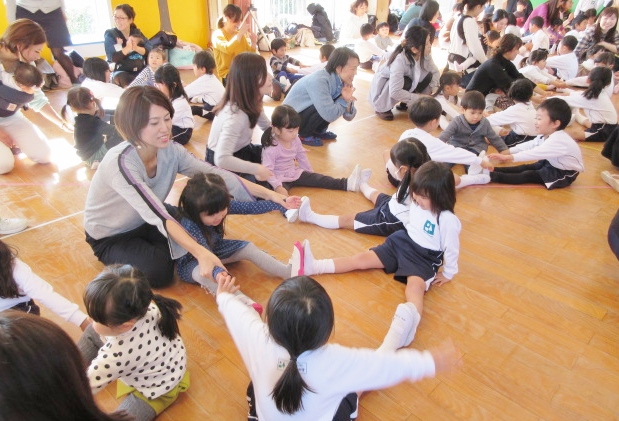 体操の先生から、「元気にがんばりましょう!まずは、体をほぐしますよ!」