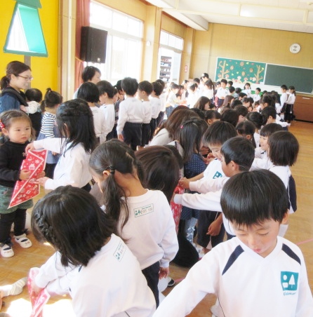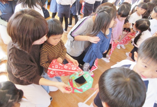 赤組さんから、小さなお友達に、赤い袋のプレゼントを「はい!そうぞ!」  何が入っているのかなーーー?